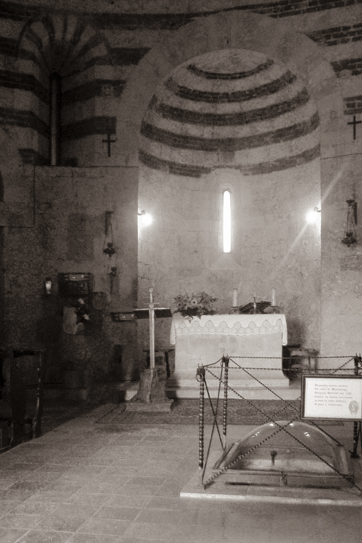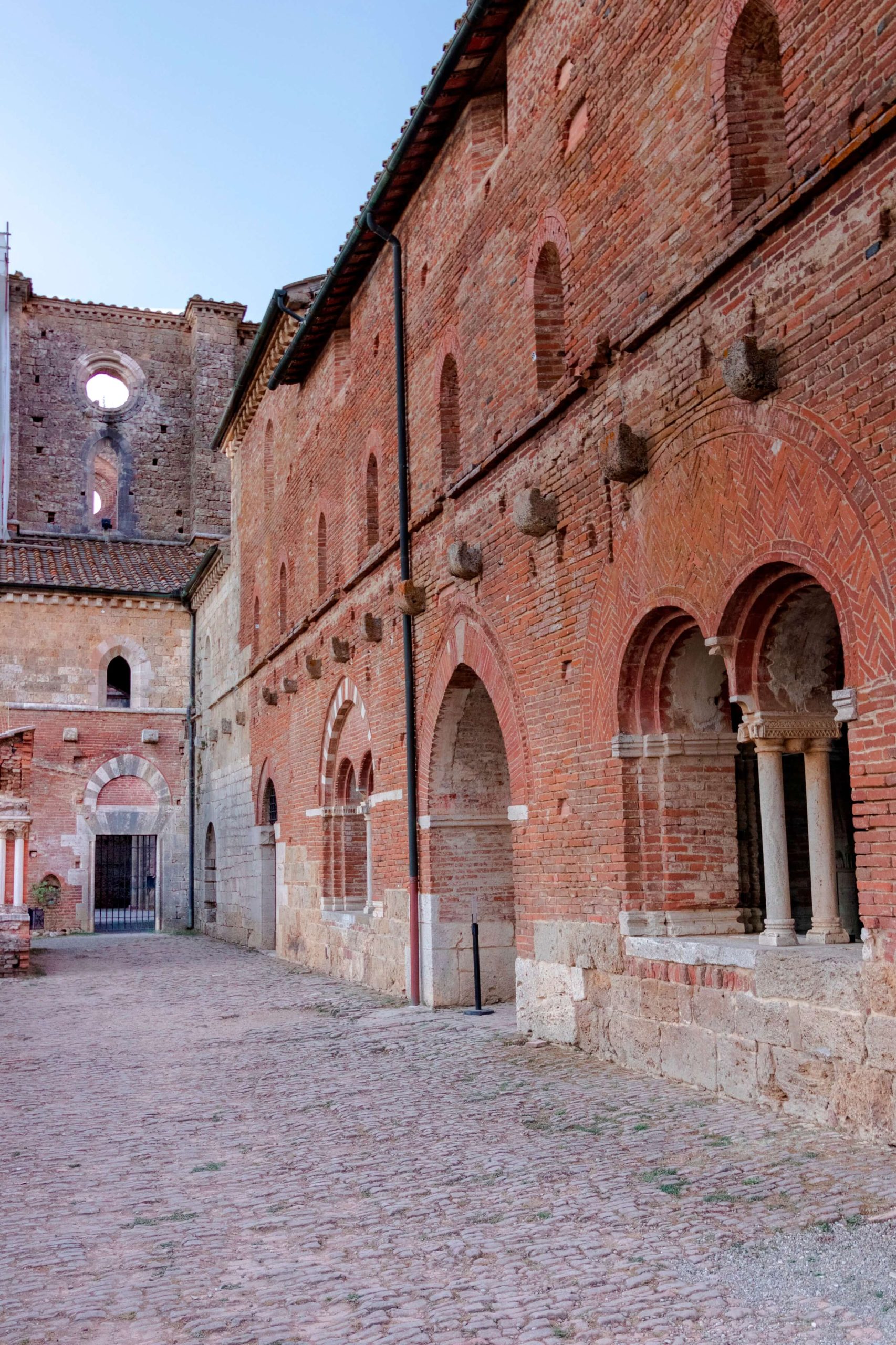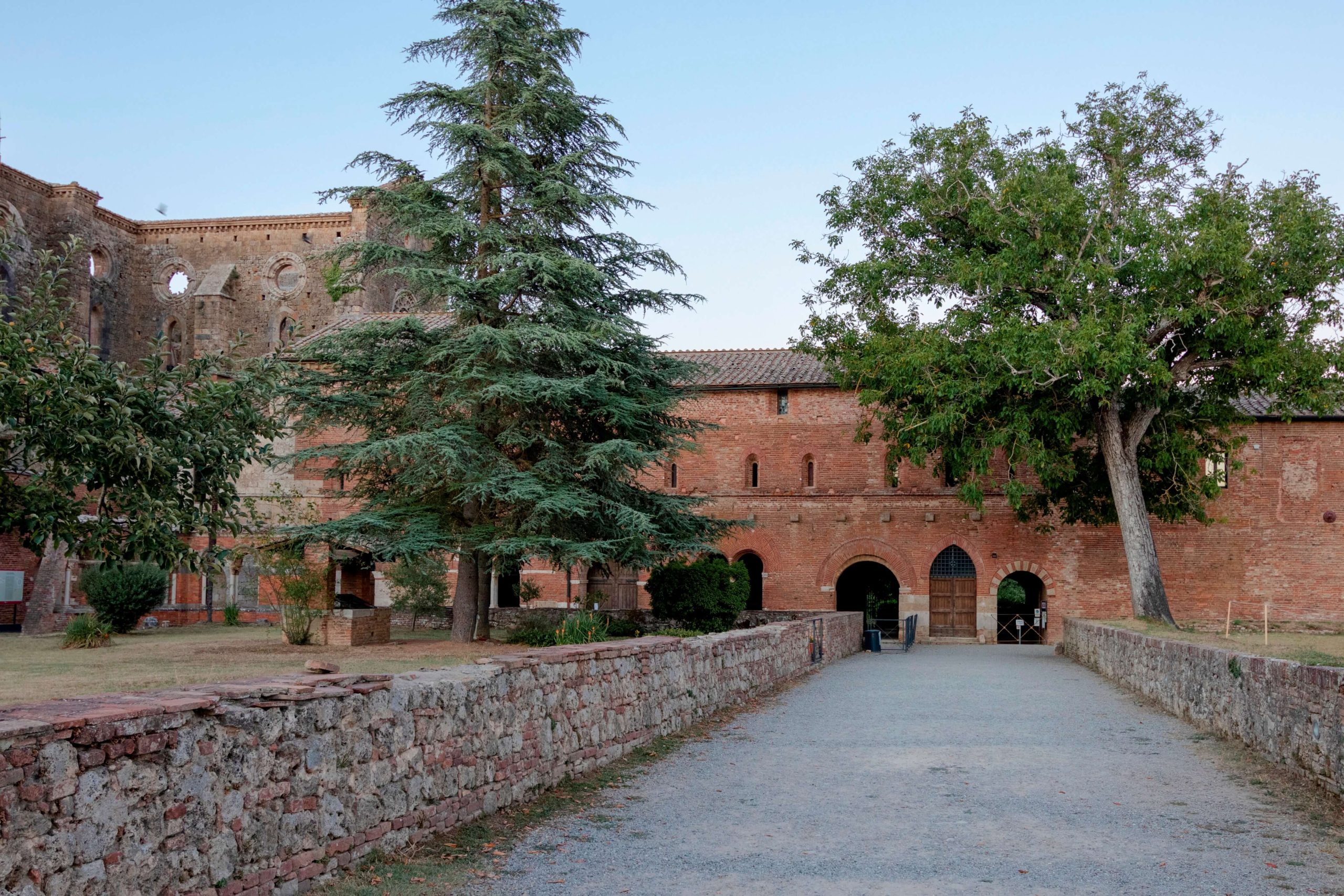Anche se ormai è rimasto poco della sua fausta bellezza di un tempo, possiamo ancora contemplare la sua maestosità. Giunti sul viale prospiciente la facciata principale, respiriamo l’aria delle Crete Senesi, definite come paesaggi magici e suggestivi, costituiti da una cascina isolata, magari posta in cima ad un colle, il cui viale di accesso è costeggiato da cipressi. In questo caso abbiamo, sì un viale con cipressi, ma ben più di una cascina, un monastero e una cappella con all’interno una spada nella roccia!