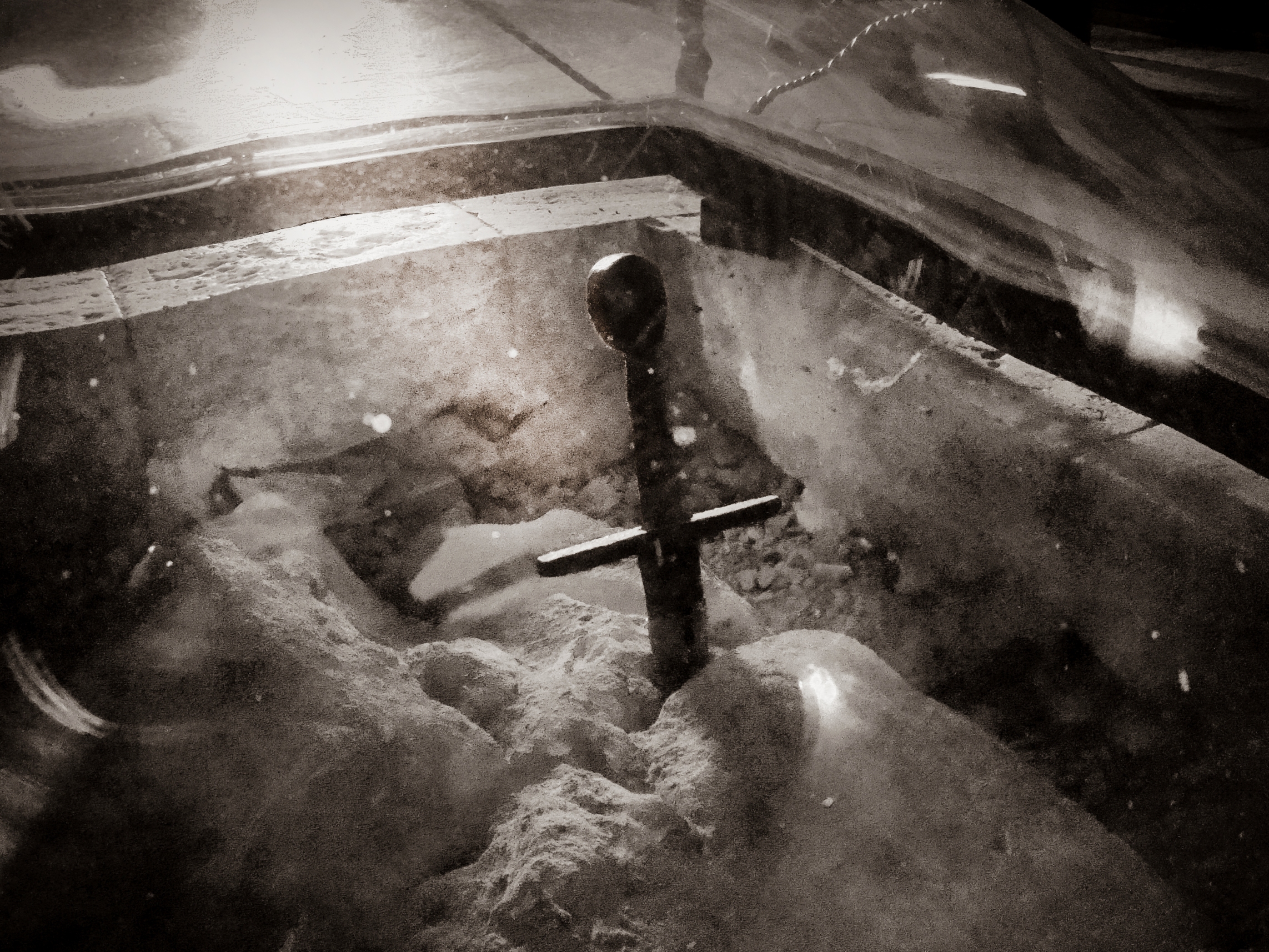 Con mio rammarico ho potuto constatare che oggi purtroppo la spada è danneggiata perché qualche “genio” ha pensato bene di provare ad estrarla. Ecco spiegata la teca a protezione della spada, ma soprattutto il rinforzo di acciaio che avvolge la spada all’altezza della roccia.