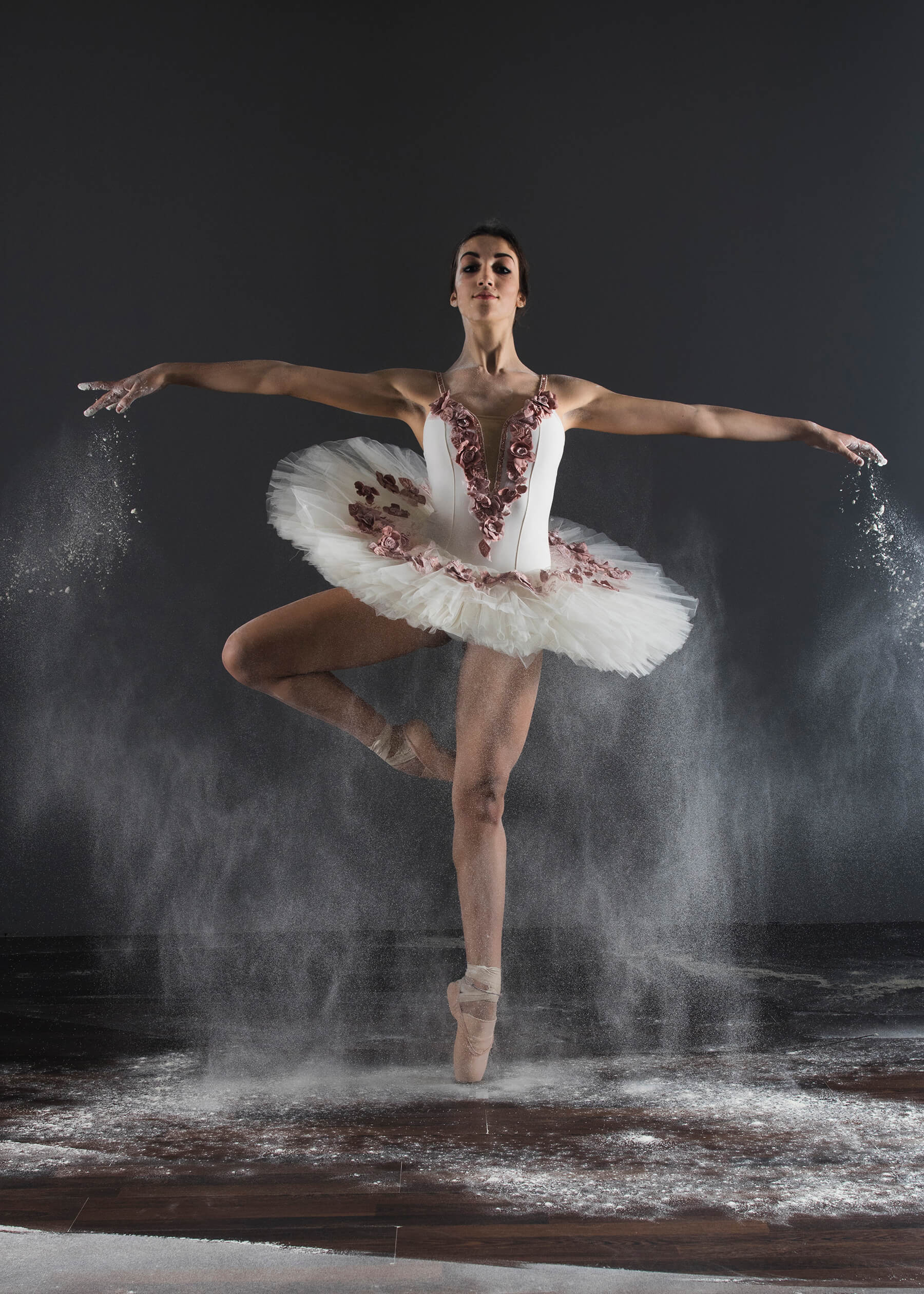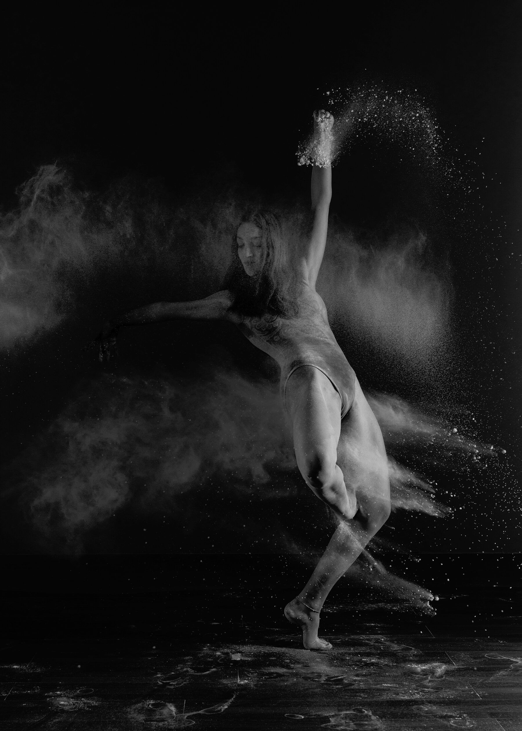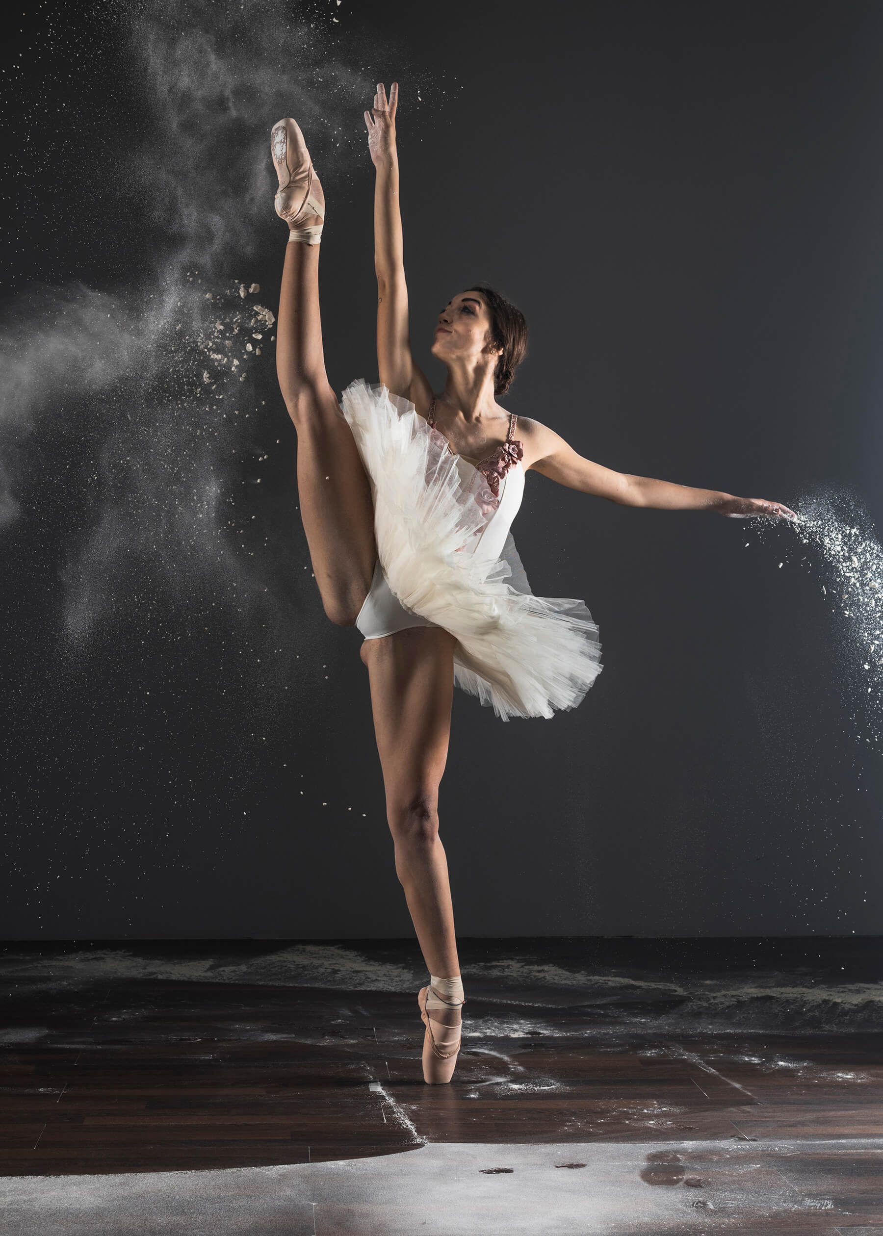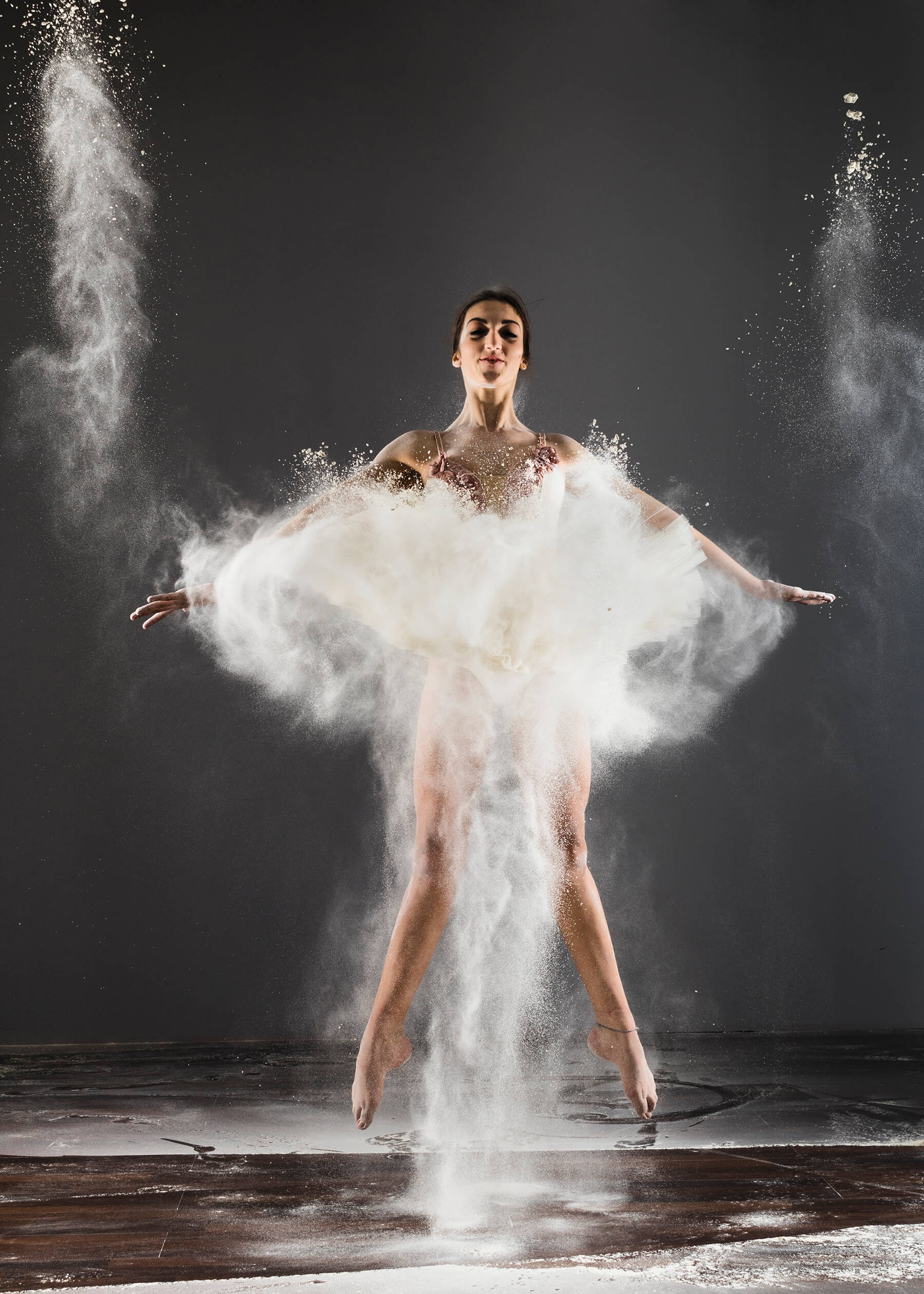 La ballerina attraversa la farina, ci salta dentro, ma le viene anche lanciata contro oppure è lei stessa che la rilascia a seconda dei “passi” e delle movenze scelte. Una “semplice piroette” diventa ancor più un vortice, un salto diventa un lancio come se fosse un razzo che lascia la sua scia in fase di decollo.